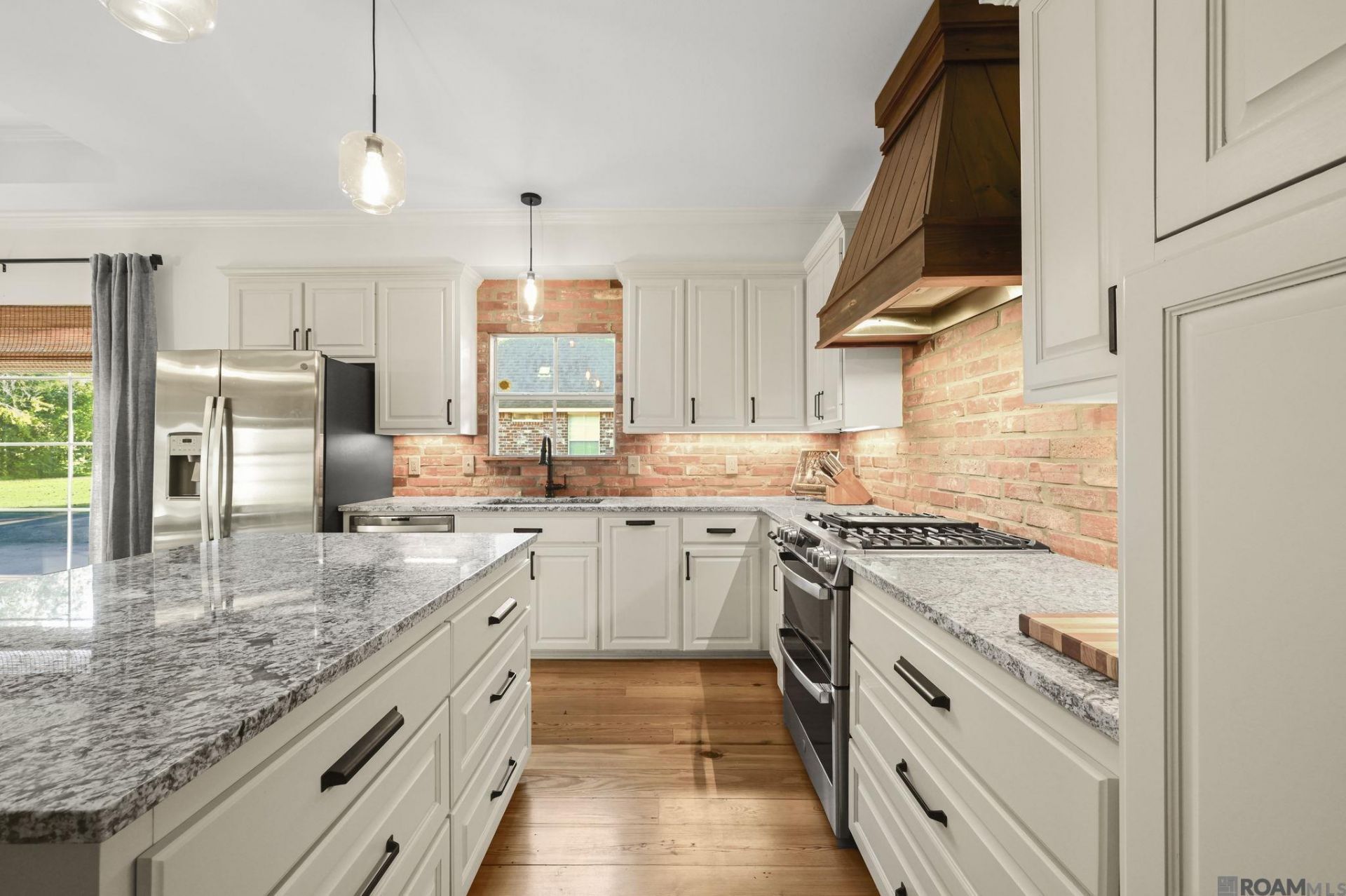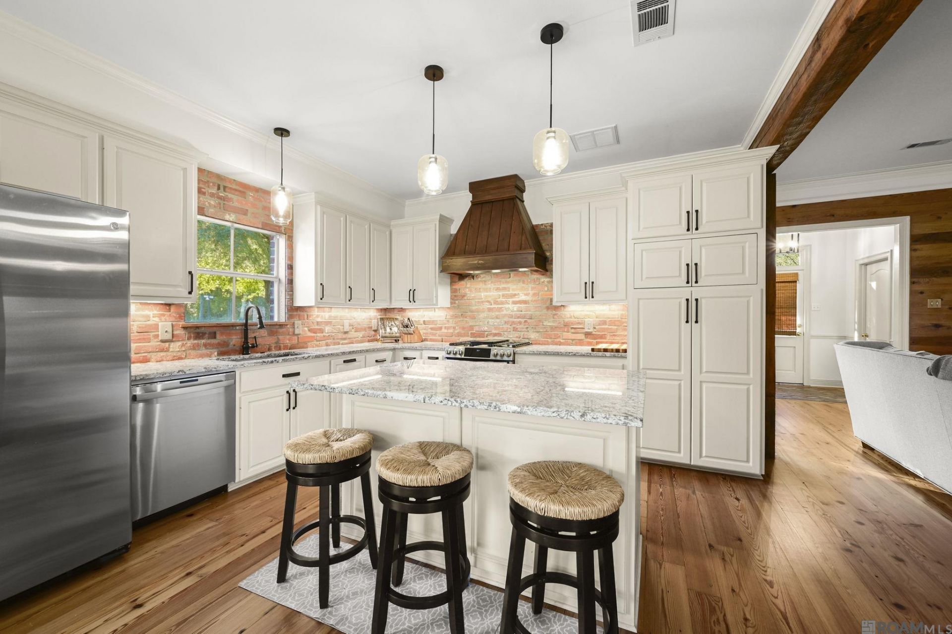 Located in desirable Stumberg Place subdivision, this beautifully updated 3 bedroom, 2 bath home offers both charm and convenience in a prime location. Inside, you'll find stunning reclaimed heart of pine flooring throughout and an open floor plan designed for comfortable living and entertaining. The kitchen is a true standout, featuring a large island, brick backsplash, granite countertops, and a gas stove. Architectural details like cypress beams and a cozy wood-burning fireplace add warmth and character, while a separate dining room provides the perfect space for gatherings. The spacious primary suite includes dual vanities, a separate shower, and a relaxing soaking tub. Step outside to enjoy a serene backyard setting, along with the added convenience of two carports. This home combines timeless style with thoughtful updates in one of the area's most sought-after neighborhoods. Located in flood zone X.