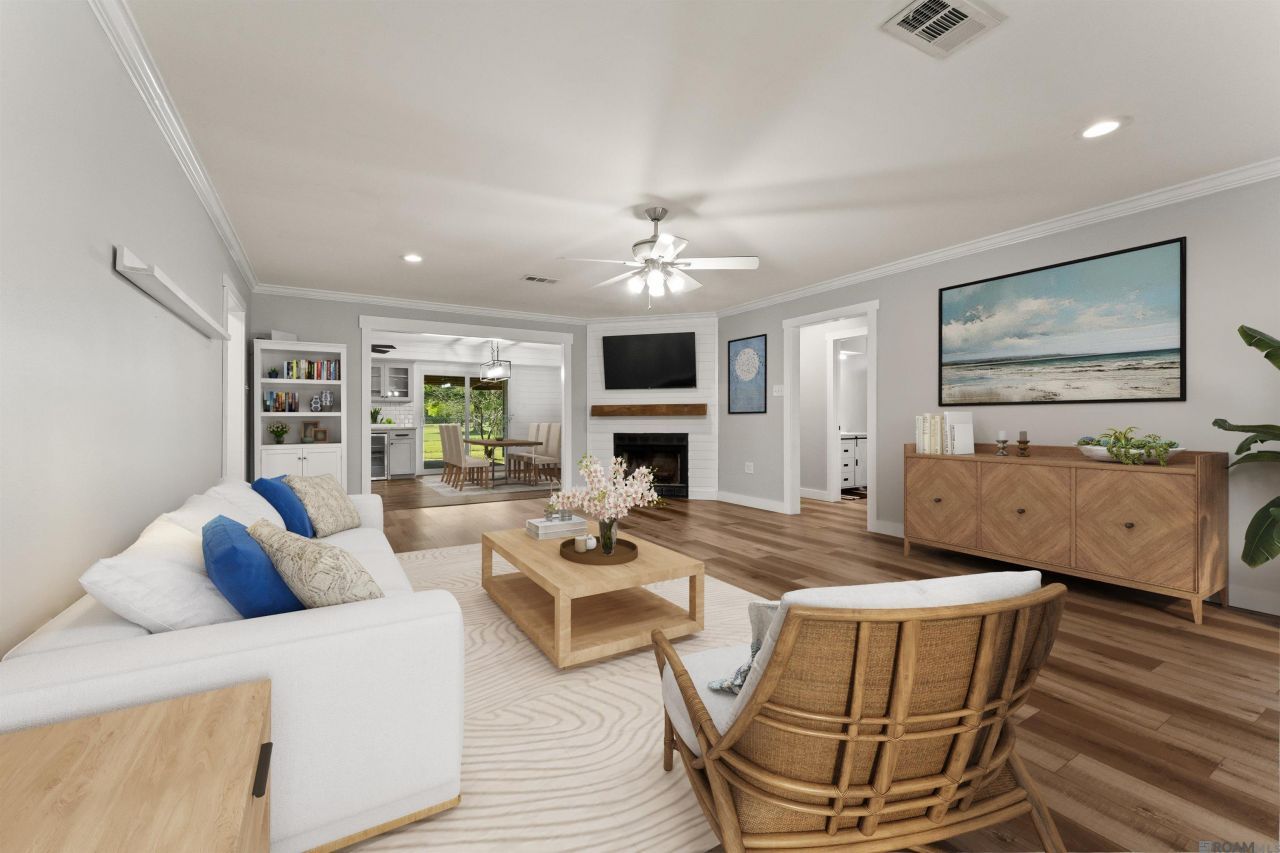 Move-in ready home on nearly 1.7 acres in Slaughter! This rare find is a beautifully updated 4-bedroom, 2-bathroom home offering the perfect blend of modern comfort and country living. Enjoy peace of mind with a 3-year-old HVAC system, and a whole-home generator. Inside, the open-concept layout features no carpet throughout, crown molding, and a cozy living room fireplace with a wood mantle. The kitchen is complete with a farmhouse sink, subway tile backsplash, stainless steel appliances, gas range, pot filler, and ample cabinetry. The dining area is directly connected to the kitchen and features sliding doors leading to a covered patio. Outdoor enthusiasts will appreciate the spacious 24x30 storage building, ideal for a workshop or equipment. With plenty of room to spread out, this property offers the privacy and seclusion of country living while still being move-in ready.
