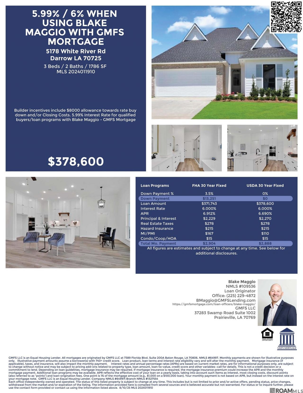 Open 1-5 p.m., Friday-Sunday. Amazing new Kensington 3 BR + Office Plan offers luxury throughout and wonderful outdoor spaces for entertaining and enjoying your home every evening. 2 Fireplaces...1 inside and 1 opposite your outdoor kitchen. Tall ceilings, crown molding, shiplap wall in foyer, office with built-ins, custom cabinets to the ceiling, split plan with gorgeous primary suite. Freestanding luxurious rectangle soaking tub, oversized custom tiled shower, and large closet with chest of drawers connects to Laundry Room with ample cabinets and counterspace. There is a mud-bench area off the garage. The office has custom built in desk with floating shelves. Kitchen has cabinets to the ceiling, island, pantry, 5 burner gas range with air fry feature, microwave built in (not above range), undercabinet lighting, and 3 CM granite. Beautiful luxury vinyl plank flooring throughout, NO CARPET. Energy efficient with radiant barrier roof decking, high efficiency vinyl windows, extra insulation in attic equals low utility bills. Measurements deemed reliable but are not guaranteed by seller, broker or agent. $4000 in Seller Paid Closing Costs when financing is with Blake Maggio with GMFS in Prairieville.